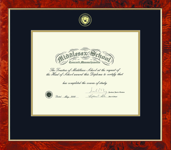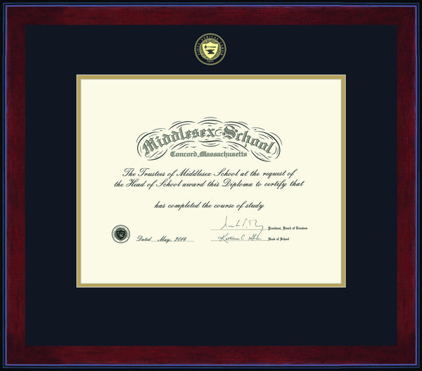 Quality wood frames with customized matting and glass accurately sized for the Middlesex diploma (14"x17"). A perfect graduation gift, frames come ready to hang with easy mounting instructions. Black and gold double matting with an embossed Middlesex shield, available in two frame options: Cherry or Traditional.